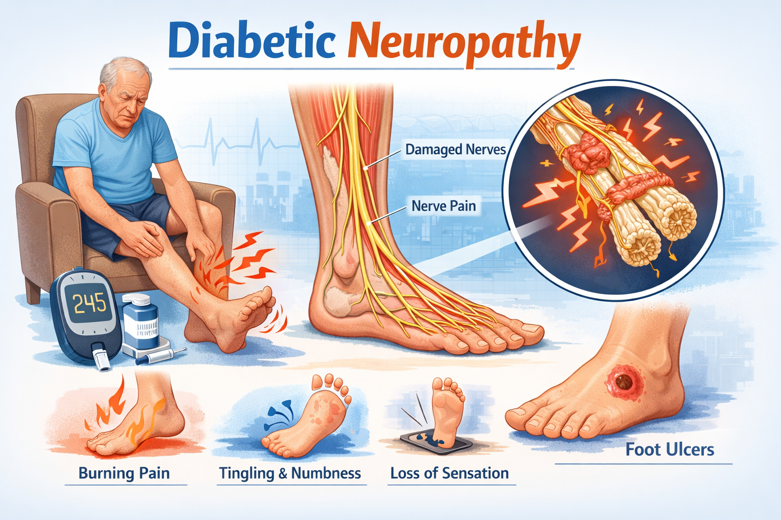 Q: Is diabetic neuropathy painful? A: Yes, for many patients it causes burning, stabbing, or electric-shock-like pain — especially at night.