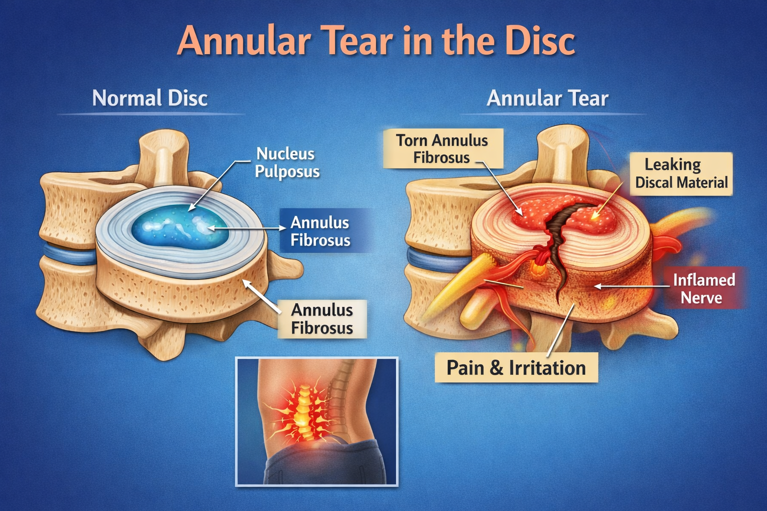 ✔ Annular tear is common and often not serious